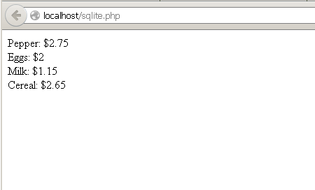 Once done, save your changes and ensure that your Apache server is running. Then, browse to http://localhost/sqlite.php to execute the script. You should see something like this: